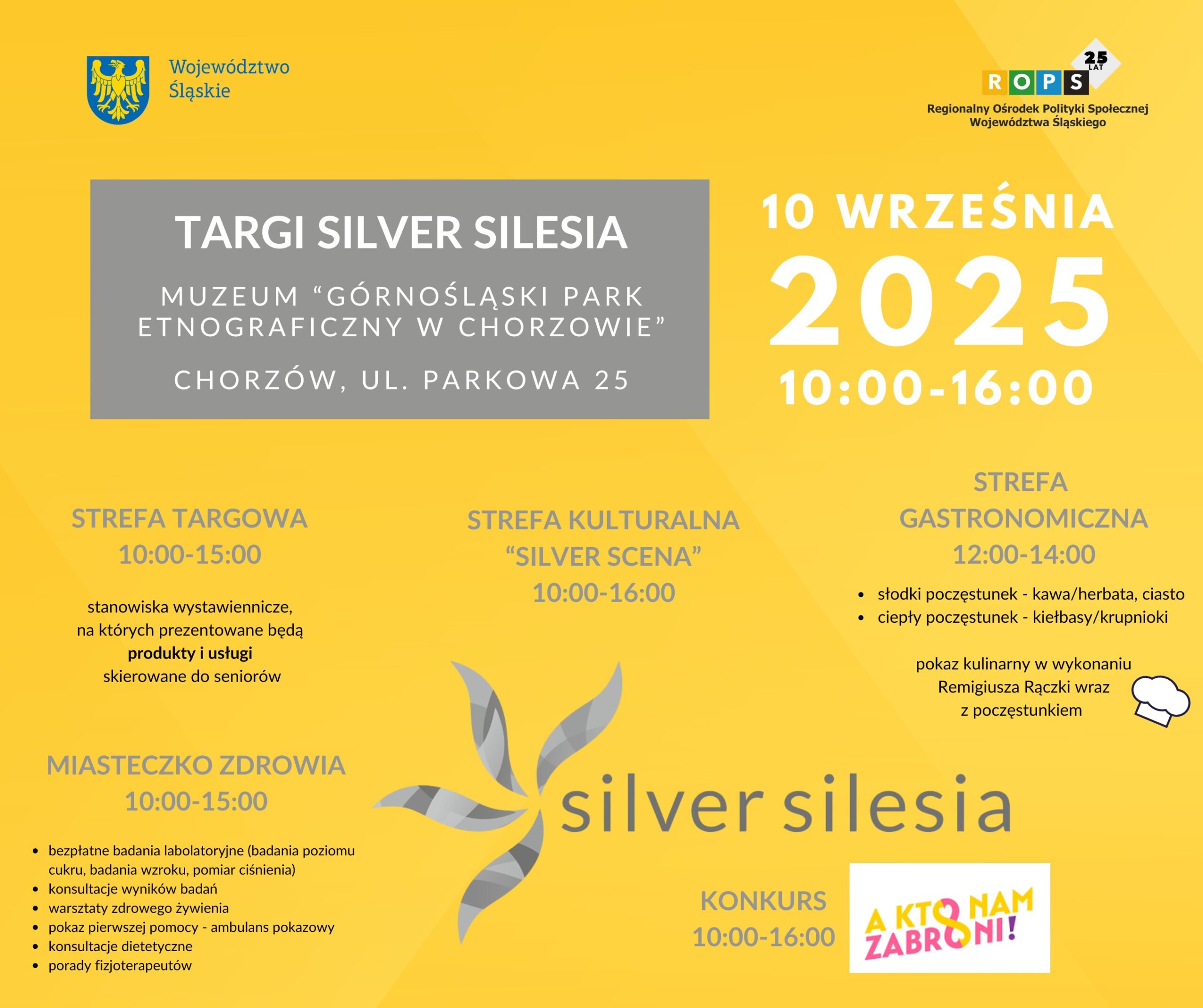 Regionalny Ośrodek Polityki Społecznej Województwa Śląskiego serdecznie zaprasza na Targi Silver Silesia, które odbędą się 10 września 2025 r. w godz. 10:00–16:00 w Muzeum „Górnośląski Park Etnograficzny w Chorzowie” przy ul. Parkowej 25.